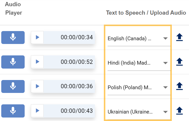 - You can select from a number of narration voices from the drop-down menu under Text to Speech / Upload Audio.